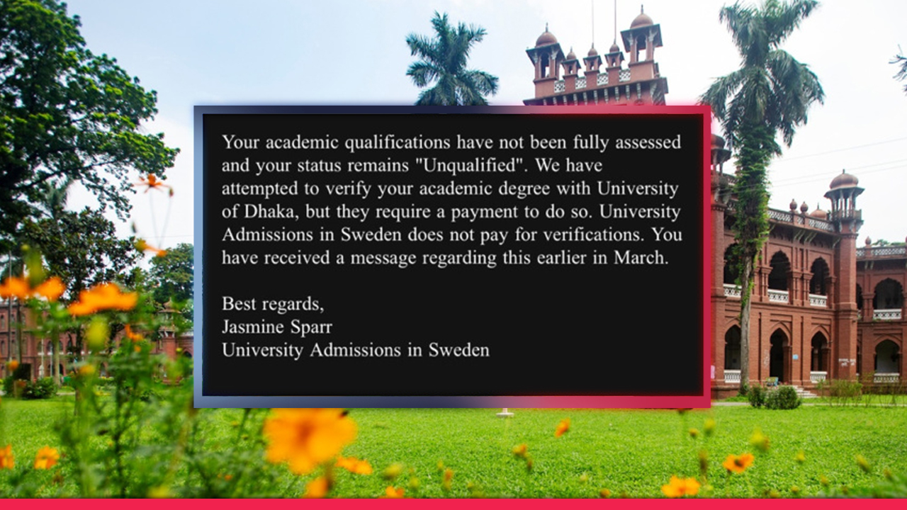 ঢাকা বিশ্ববিদ্যালয়ের প্রশাসনিক গাফিলতি এবং নথিপত্র যাচাইয়ের জন্য অতিরিক্ত অর্থ দাবির কারণে সুইডেনের বিশ্ববিদ্যালয়ে উচ্চশিক্ষার সুযোগ হারালেন এক মেধাবী শিক্ষার্থী। খাদ্য ও পুষ্টি বিজ্ঞান বিভাগের ২০১৭-১৮ সেশনের শিক্ষার্থী জিনিয়া তাসনিমের অভিযোগ, তার একাডেমিক যোগ্যতা থাকা সত্ত্বেও বিশ্ববিদ্যালয়ের আমলাতান্ত্রিক জটিলতা ও ‘ভেরিফিকেশন ফি’ সংক্রান্ত ঝামেলার কারণে সুইডিশ কর্তৃপক্ষ তার আবেদন বাতিল করে দিয়েছে। স্বপ্নভঙ্গের এই ঘটনায় ঢাবি প্রশাসনের চরম অব্যবস্থাপনা নিয়ে তীব্র ক্ষোভের সৃষ্টি হয়েছে।