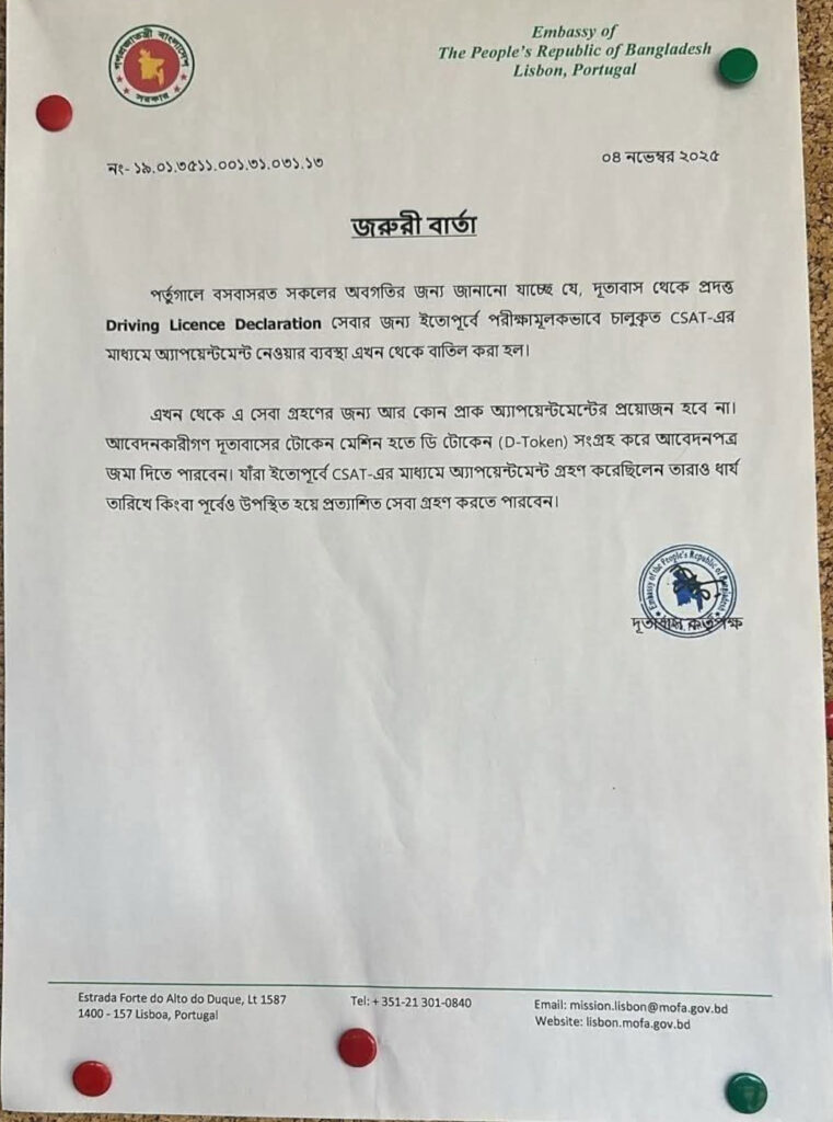 পর্তুগালে বসবাসরত প্রবাসী বাংলাদেশিদের জন্য লিসবনে অবস্থিত বাংলাদেশ দূতাবাস এক গুরুত্বপূর্ণ ঘোষণা দিয়েছে। দূতাবাস থেকে প্রদত্ত ড্রাইভিং লাইসেন্স ডিক্লারেশন সেবার আবেদন প্রক্রিয়ায় বড় পরিবর্তন আনা হয়েছে।
